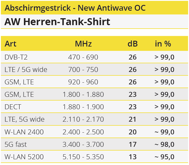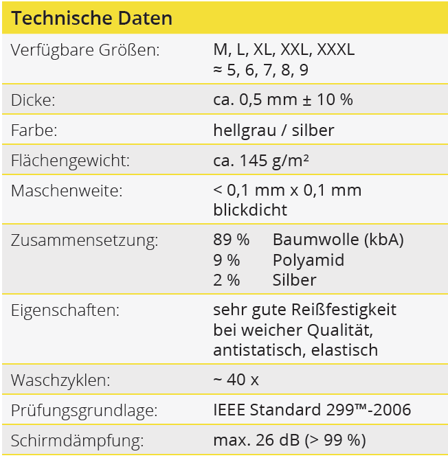 Durch den innovativen Aufbau der Stoffkonstruktion und den Einsatz hochwertiger Materialien schützt dieses Gestrick gegen elektromagnetische Strahlung mit einem Wirkungsgrad von > 99 %. Dies bestätigt ein Gutachten vom EMV Test Lab Bavaria.