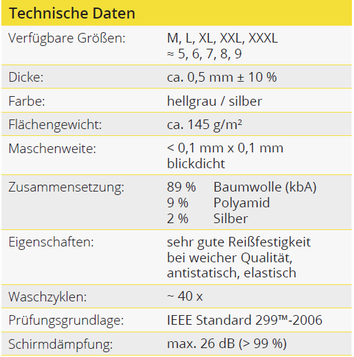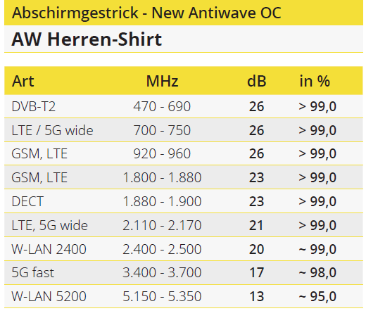 Durch den innovativen Aufbau der Stoffkonstruktion und den Einsatz hochwertiger Materialien schützt dieses Gestrick gegen elektromagnetische Strahlung mit einem Wirkungsgrad von > 99 %. Dies bestätigt ein Gutachten vom EMV Test Lab Bavaria.